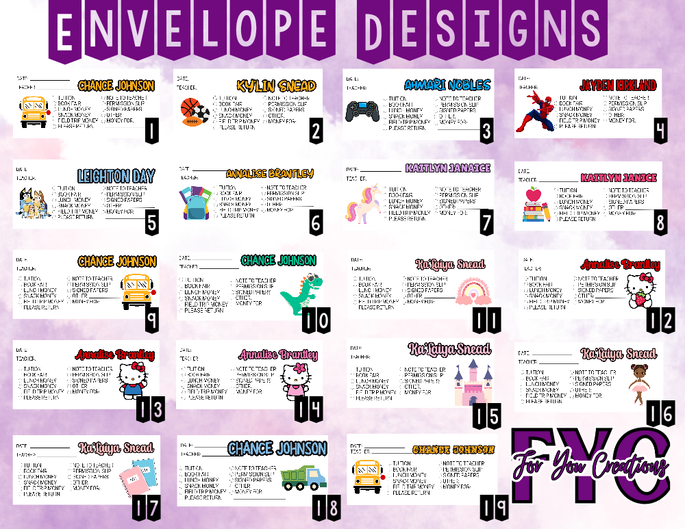 Customized 4.5x9.5 self-sealing envelope with your child's name (please include in the comments) and the design of your choice.